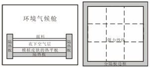 热平板测试用于研究织物系统(皮肤层-空气层-织物层-外界环境)的热传递性能。测试装置一般是对现有织物热传递性能测试装置(如出汗热平板仪)的改进,主要包括:可模拟皮肤温度的热平板、防止热量从侧面和底部散失的隔热保温板、可模拟不同厚度的衣下间隔板、温度传感器、热流传感器和人工气候箱。为了防止面料由于自重而下垂影响衣下空气层,还会在分隔板上利用强力尼龙纱线制成网格状,以托起面料,保证衣下空气层厚度的准确,如图1所示。