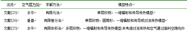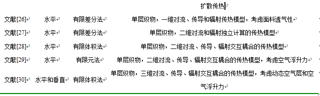平板测试和假人测试仅能定性或定量地研究各因素对于衣下空气层隔热性能的影响,而数值模拟则在此基础上更进一步诠释衣下空气层的热传递机制。因此,学者们对于衣下空气层建立了大量数值热传递模型(表1)。从表1可以看出,热传递模型已经从一维向三维、单层空气层向多层空气层、单一传热方式向多种传热方式的方向发展。