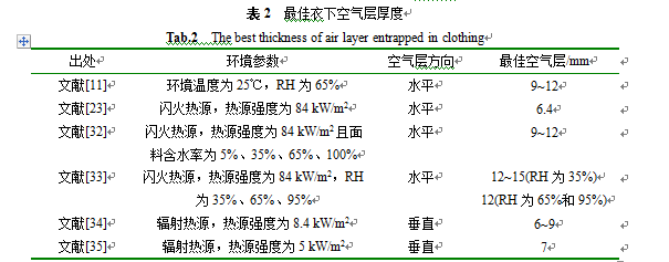 文献[11, 23, 32-35]基于热平板测试法测定了常温环境和火场环境的佳空气层,如表2所示。对比发现,火场环境的佳空气层一般比常温环境的小,原因是火场环境的气温较高,即皮肤与服装之间的温差较大,根据式(1),若?T较大,而Ra固定不变,则发生自然对流的衣下空气层厚度将较小,因此,火场环境的佳空气层较小。