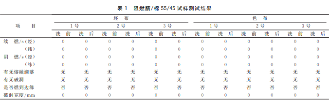 重复进行全部试样测试,并按ISO-15025的规定报告测试结果。经国内一外贸企业试用,对阻燃腈棉(混纺比 A/C55/45)坯布与色布洗前洗后按照ISO15025进行测试,其结果如表1所示。