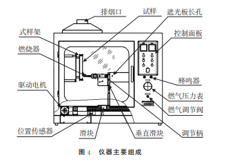 仪器组成部分包括燃烧器,燃烧器 调 节、移 动 机构,燃气供气系统,试样支撑装置,续燃、阴燃计时器装置,控制系统,安全保护装置及箱体结构等,见图4。