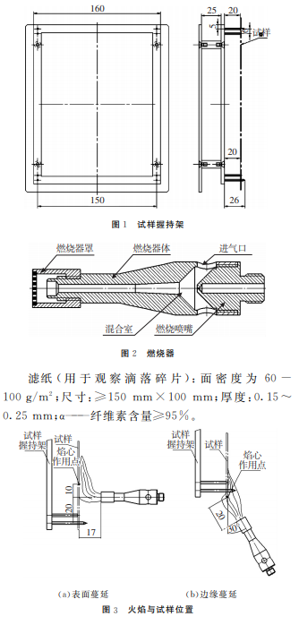 燃气,优先采用商业级丙烷;试样握持架,见图1;燃烧器,见图2;火焰长度,垂直方向(40±2)mm(用于底边缘燃烧),水平方向(25±2)mm(用于表面燃烧);火焰燃烧点与试样的位置,见图3;计时器精度<0.2s。