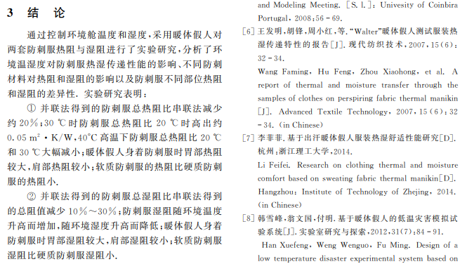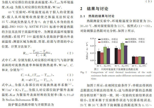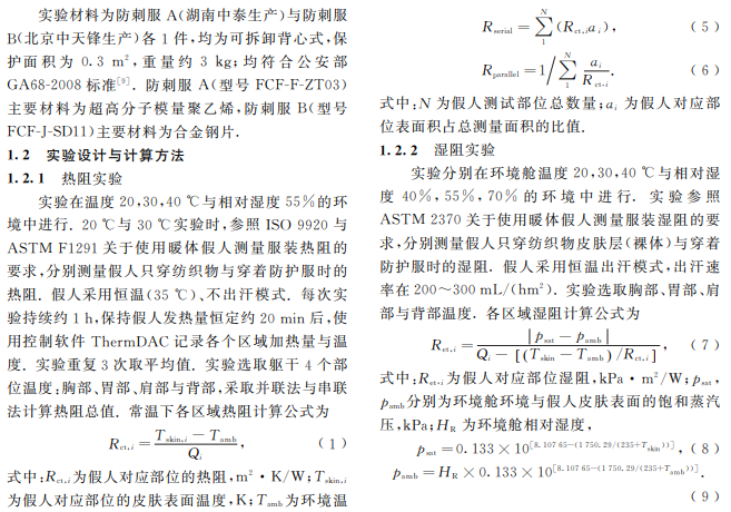 暖体假人研发应用已有70多年,是测量常温下服装 热 阻 湿 阻 的 理 想 工 具 之 一. “Walter”与“Newton”是目前 使 用 为 广 泛 的 两 种 暖 体 假 人.“Newton” 由 美 国 Measurement TechnologyNorthwest公司采用导热铝填充碳纤维外壳制造,可以实现多分区的温度、排汗量单独控制.暖体假人“Walter”由香港理工大学采用防水纤维制造,可以实现全躯干整 体 温 度 控 制[5].王 发 明 等[6]利 用“Walter”出汗暖体假人在室温下测试了3组着装的热湿传递特性,分析在不同地域测试的实验结果的一致性及存在的差异;李菲菲[7]利用“Walter”出汗暖体假人研究了在寒冷环境下不同类型保暖服装的热阻湿阻;韩雪峰等[8]利用“Newton”出汗暖体假人开发了低温灾害模拟试验系统,模拟了人类生理活动.暖体假人在室温与低温环境下模拟人体、服装与环境的热交换过程,评价客观、重复性好.而高温下由于环境温度高于假人设置体温,导致假人体温无法维持恒定,因此发热量几乎为0,假人无法正常测定服装热阻和湿阻.本文建立的高温下测定热阻和湿阻方法扩展了暖体假人的适用范围,为系统性研究环境参数对防刺服热阻和湿阻的影响提供了理论和实验依据.