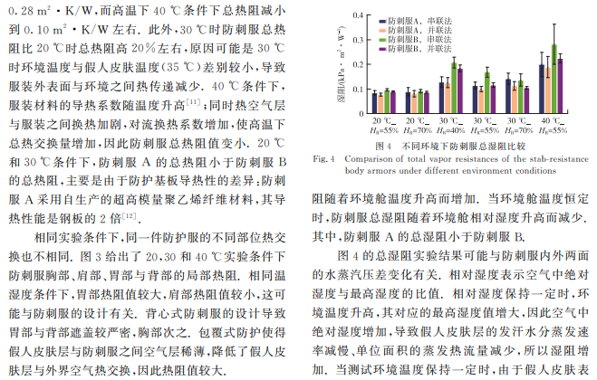 一般情况下,人体核心温度需要在37℃左右以保持舒适[2].防刺服作为人与环境间热量交换的重要介质,参与建立了人体 服装和服装 环境两个热交换环境.作为特殊防护装备,防刺服的隔热和传湿性能与一般服装有很大不同,多层基板往往会激发人体热应力,使警卫安保人员感到心理压力和生理疲惫[3],从而带来危险.因此研究防刺服的热湿传递性能有利于满足人体与环境间动态热平衡、实现人体 防刺服 环境系统的协调优、预防因热量堆积导致体能速降和穿着不适带来造成的危险.服装的热湿传递性能测试方法有主观评价法和客观测量法.主观评价方法偶然性较强,不同个体接受 认知 反应的差别导致测试结果存在较大差异.客观测量法通常通过测量服装热阻与湿阻,对其热湿传递性能进行评价.服装热阻表征了服装层两面的温度差与垂直通过服装单位面积的热流量之比,反映了服装的隔热保暖能力;湿阻表征了服装层两面的水蒸汽压力差与垂直通过服装单位面的蒸发热流量之比,反映了服装的透湿能力[4].