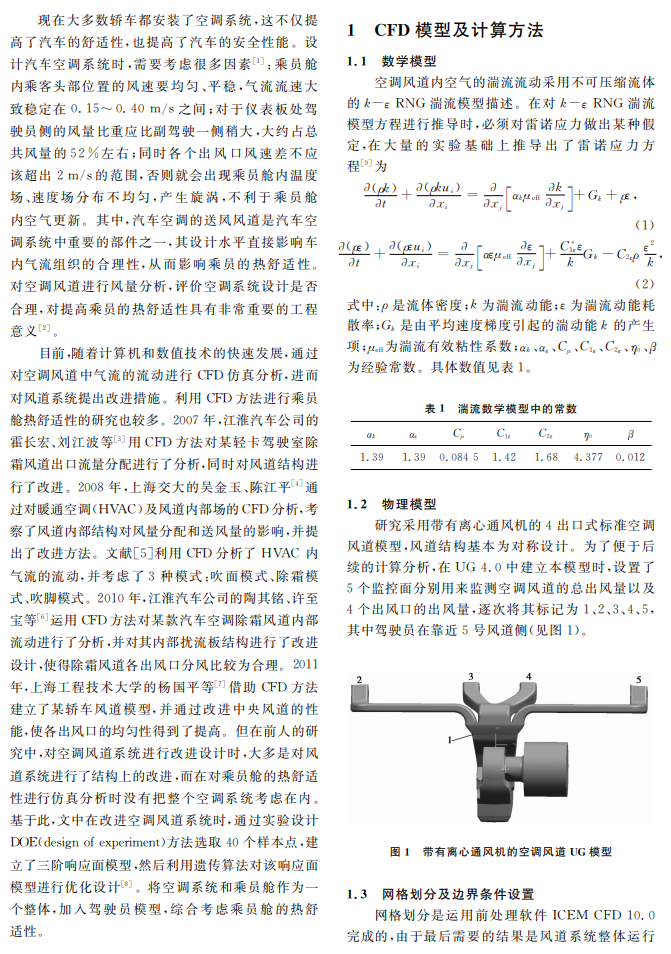 现在大多数轿车都安装了空调系统,这不仅提高了汽车的舒适性,也提高了汽车的安全性能。设计汽车空调系统时,需要考虑很多因素:乘员舱内乘客头部位置的风速要均匀、平稳,气流流速大致稳定在0.15~0.40m/s之间;对于仪表板处驾驶员侧的风量比重应比副驾驶一侧稍大,大约占总共风量的52%左右;同时 各 个 出 风 口 风 速 差 不 应该超出2m/s的范围,否则就会出现乘员舱内温度场、速度场 分 布 不 均 匀,产 生 旋 涡,不 利 于 乘 员 舱内空气更新。其中,汽车空调的送风风道是汽车空调系统中重要的部件之一,其设计水平直接影响车内气流组织的合理性,从而影响乘员的热舒适性。对空调风道进行风量分析,评价空调系统设计是否合理,对提高乘员的热舒适性具有非常重要的工程意义。