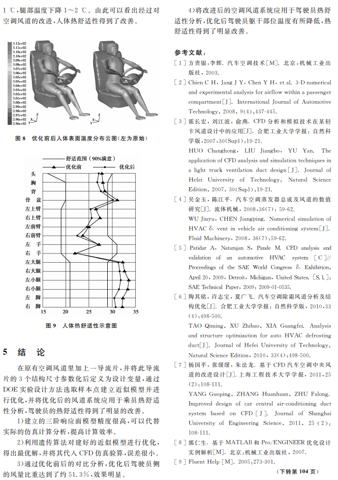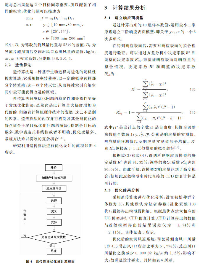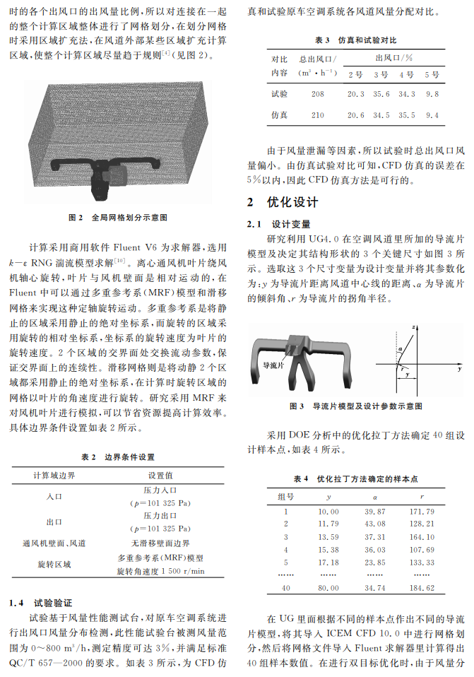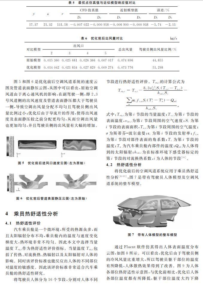 目前,随着计算机和数值技术的快速发展,通过对空调风道中气流的流动进行 CFD 仿真分析,进而对风道系统提出改进措施。利用 CFD方法进行乘员舱热舒适性的研究也较多。2007年,江淮汽车公司的霍长宏、刘江波等[3]用 CFD 方法对某轻卡驾驶室除霜风道出口流量分配进行了分析,同时对风道结构进行了改进。2008年,上海交大的吴金玉、陈江平[4]通过对暖通空调(HVAC)及风道内部场的CFD分析,考察了风道内部结构对风量分配和送风量的影响,并提出了改进方法。文献[5]利用 CFD分析了 HVAC 内气流的流动,并考虑了3种模式:吹面模式、除霜模式、吹脚模式。2010年,江淮汽车公司的陶其铭、许至宝等[6]运用CFD方法对某款汽车空调除霜风道内部流动进行了分析,并对其内部扰流板结构进行了改进设计,使得除霜风道各出风口分风比较为合理。2011年,上海工程技术大学的杨国平等[7]借助 CFD 方法建立了某轿车风道模型,并通过改进中央风道的性能,使各出风口的均匀性得到了提高。但在前人的研究中,对空调风道系统进行改进设计时,大多是对风道系统进行了结构上的改进,而在对乘员舱的热舒适性进行仿真分析时没有把整个空调系统考虑在内。基于此,文中在改进空调风道系统时,通过实验设计DOE(designofexperiment)方法选取40个样本点,建立了三阶响应面模型,然后利用遗传算法对该响应面模型进行优化设计。将空调系统和乘员舱作为一个整体,加入驾驶员模型,综合考虑乘员舱的热舒适性。