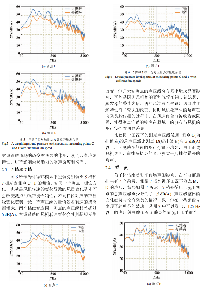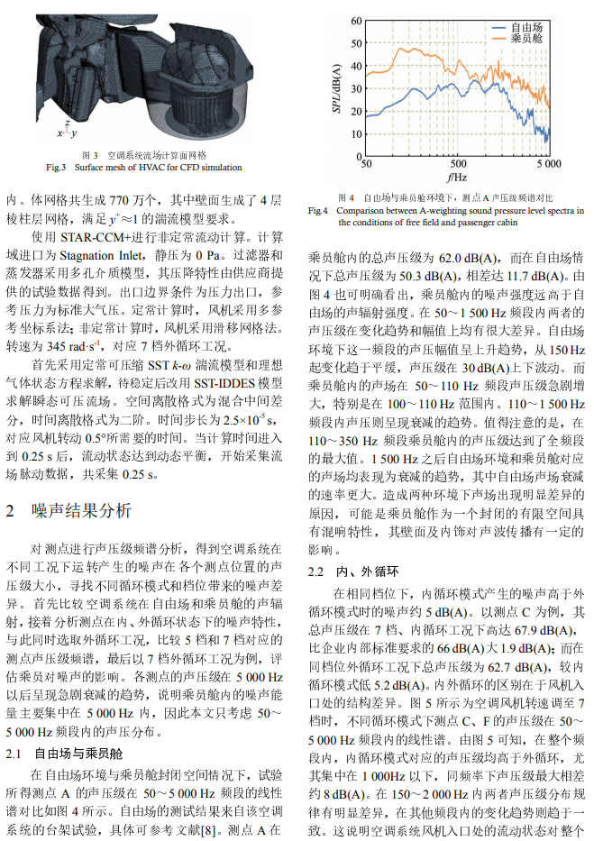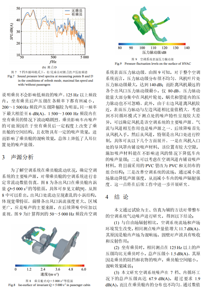 仿真发现,风机是主要噪声源,气流与风道相互作用产生的噪声是次要噪声源。而乘员舱内的噪声呈现明显的宽频噪声特性,有别于主要声源风机的离散噪声特性,说明风道对流动及噪声的产生与传播有重要影响,后续应综合考虑风机噪声和风道噪声的控制。