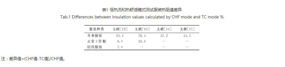 3种模式对应3种不同的算法,因而测试结果也不同。表1示出文献[12]~[15]使用不同方法测试服装热阻时,恒热流模式测试值与热舒适模式测试值的差异。由表可知,恒热流模式测试结果显着高于热舒适模式,差异大可达78.4%。另外,服装阻值测试有ISO 9920: 2009《热环境工效学——服装热湿阻值评估》、ISO 7730: 2005《热环境工效学——使用PMV、PPD、局部热舒适指标计算热舒适》、ASHARE 55—2013《人类居住热环境条件》、ASTM F1291—2016《使用暖体假人测试服装热阻的标准测试方法》等多种标准,不同标准对测试细节规定不同,如ISO 9920恒皮温模式规定皮温为32~34 ℃,而ASTM F1291规定皮温为35 ℃。针对相同的服装,ISO 7730给出的热阻参考值大于ASHARE 55[16],这就使得标准化失去了意义,所以需要寻求一种更接近人体真实状态的操作模式来评价服装舒适性。