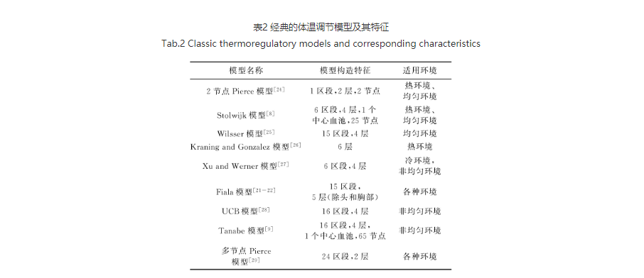 体温调节模型以数学方程的形式描述体温调节机制中的因果关系,通过求解方程预测体温调节的结果。初,体温调节模型被运用在暖通、航天等领域,后来逐渐拓展至服装领域。现有的经典模型概括见表2,其中Fiala模型和多节点Pierce模型为经验模型,其余为理论模型。理论模型的适用范围更广,经验模型在适用范围内的准确性更高[23]。