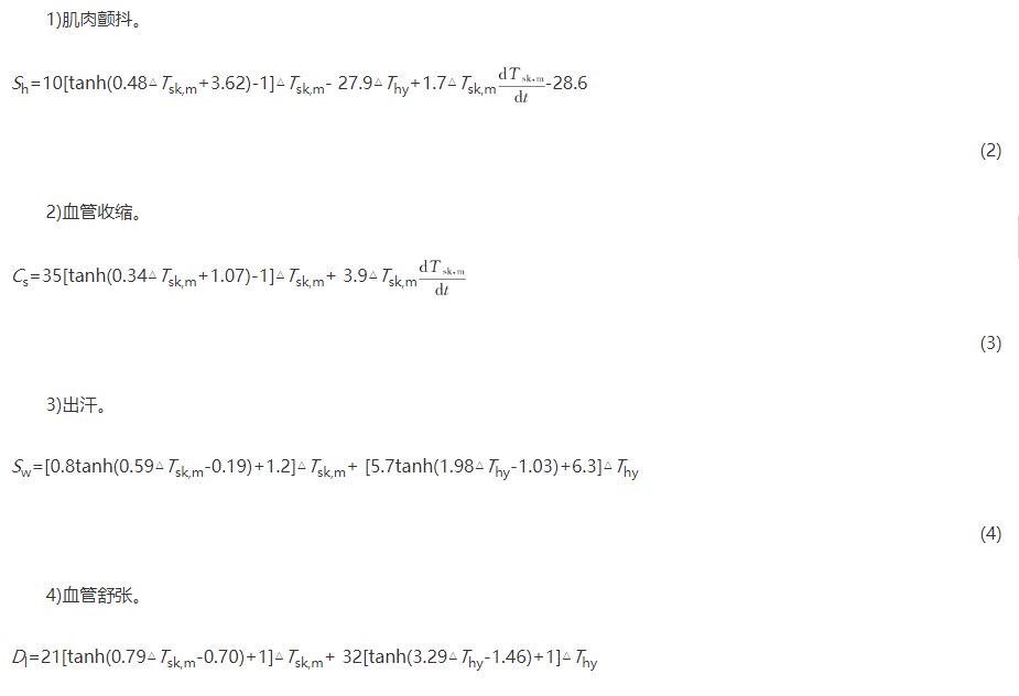 Fiala对26组独立实验结果进行回归分析,量化人体主动调节反应所起的热量调节效果,如式(2)~(5)[21]所示,热调节反应的驱动主要为皮肤和下丘脑温度与设定温度的差值。
