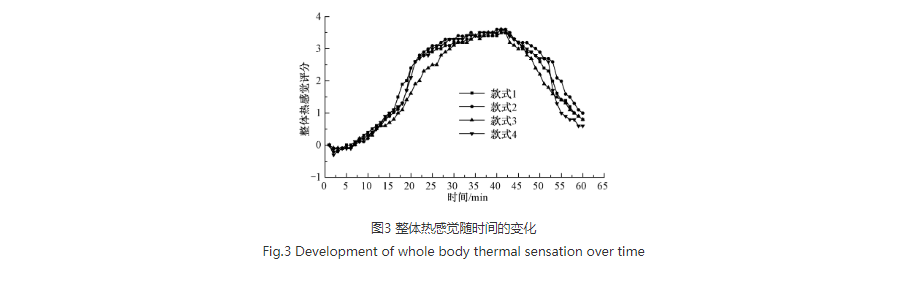 文献[7]使用Fiala热调节模型和Newton暖体假人结合,预测穿着不同面料配置运动服运动过程中体表温度和核心体温的变化趋势,然后使用UCB热舒适模型预测运动过程中人体的热感觉,由此来分析运动服面料配置对人体热湿舒适性的影响,结果如图3所示。实验结果体现了多区段体温调节模型的优势。