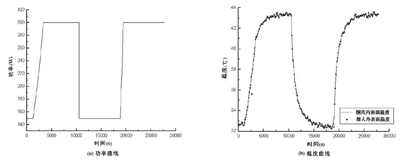 在“变功率”模式下对暖体假人进行试验,设置功率分别按照2%/min 和8%/min 的速率从150W 升高至300 W,并分别在每个功率稳定状态持续一段时间,其持续的时间长短视暖体假人表面温度达到的状态而定,其动态响应曲线如图7 所示。