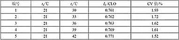暖体假人的精度是一项重要技术指标,在暖体假人的设计过程中,为了减小误差的影响,保证较高的测试精度,对暖体假人的控制温度和实际输出功率都做了标定,温度偏差小于±0.25℃,功率偏差小于5%,使系统误差降到低。为考核暖体假人的重复精度,在温度为21℃、相对湿度为60%、风速≤0.2m/s 人工气候室中进行了假人的裸体试验,试验在假人“恒皮温”模式下进行,设定假人皮肤温度分别为30,33,36,39,42℃,对暖体假人裸态CLO 值进行了10 次重复测量,结果如表1 所示。由表1 可知,本文的暖体假人具有很高的测量精度,测量相对标准差不大于2%。