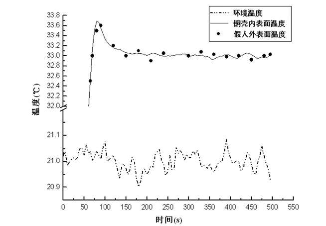 由图3 可以看出,在环境温度比较稳定(基本恒定在(21±0.5)℃范围内)的情况下,暖体假人升温200 s后,其内外表面的温度从21℃升高至33℃,并基本稳定在(33±0.2) ℃范围内,系统始终保持热平衡。