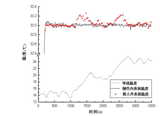 暖体假人在“恒皮温”模式下进行试验,设定“假人控温”为33℃。暖体假人从环境温度为21℃开始升温,直至达到稳定状态,其动态响应曲线如图3 所示,其中,环境温度值和暖体假人铜壳内表面温度值为系统传感器监测结果,假人外表面温度为每隔30s 用温度枪测得的暖体假人铜壳外表面的温度值。