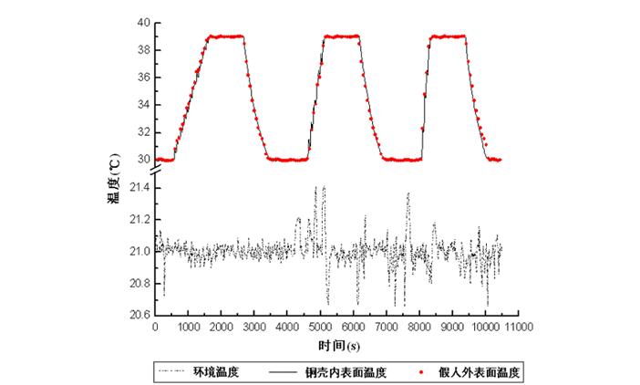 暖体假人在获得新的稳态热平衡时,必经过一动态响应过程,这一过程的特性在一定程度上反映了系统本身的结构特性和控制品质,因此,对响应过程的分析与评价可作为考核系统性能的一种重要手段。温度是储存在物体中的能量的度量,可作为表征系统热状态的变量,即可通过测定暖体假人内外表面温度的变化规律描述系统的响应过程。试验在恒温恒湿室进行,除特殊要求的变化条件,测试环境设置为温度为21℃、相对湿度为60%、风速≤0.2m/s。