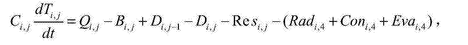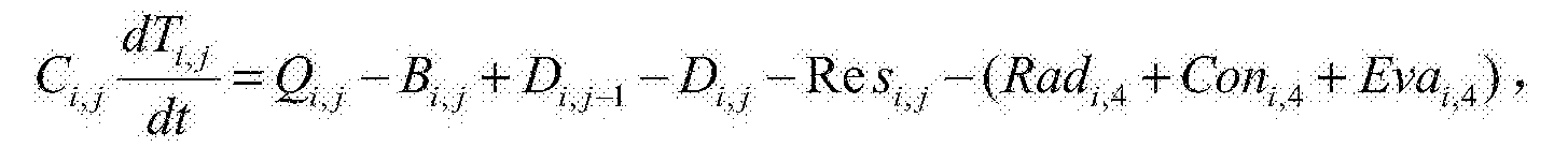 公式中,i代表人体的20个区块;j代表每个分块的四层;C为人体各节点热容,W h/°C;T为人体各区块及各层的温度,°C;t为人体暴露于环境的时间,h;Q为人体产热量,W;B为人体的血液换热量,W;D为人体同一部位内不同层之间传导热交换,W;Res为呼吸传热量,W;Rad,Con,及Eva分别为人体与环境之间的辐射、对流及蒸发换热量,W。