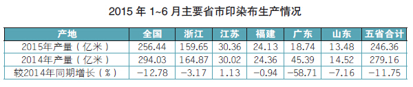 发布时间:2015-08-07 09:12标准集团(香港)有限公司纺织市场资讯:我国印染行业产量因出口放缓下降明显。2015年1~6月,规模以上印染企业印染布产量256.44亿米,较2014年同期下降12.78%,产量降幅较一季度10.74%降幅进一步加大。浙江、江苏、福建、广东和山东等东部沿海五省产量246.36亿米,占全国总产量的96.07%,除江苏外,浙江、福建、广东、山东印染布产量较2014年同期都有不同程度减少,其中广东省减少58.71%。