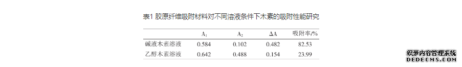 由表1可知,在吸附性能探究中,胶原纤维吸附材料对碱液木素和乙醇木素溶液都有一定的吸附性能,而且效果不同,对于碱液木素溶液其吸附率达82.53%,而对于乙醇木素溶液吸附率仅为23.99%,所以,该材料对碱液木素溶液的吸附性能要优于对乙醇木素溶液的吸附性能,具有一定的选择性吸附能力。